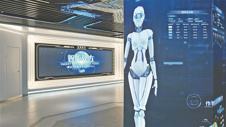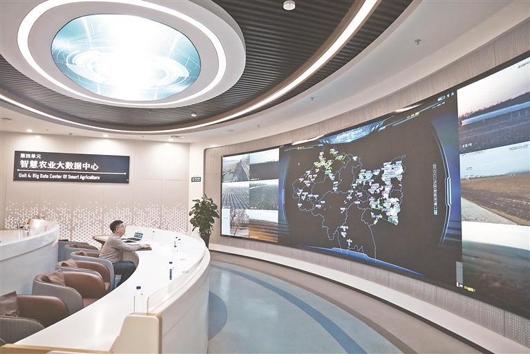 位于智慧農(nóng)業(yè)農(nóng)機(jī)中心二樓的數(shù)字平臺(tái)是七星農(nóng)場(chǎng)的“大腦”,通過集成5G、大數(shù)據(jù)等新技術(shù),實(shí)現(xiàn)了對(duì)農(nóng)作物生長全過程的精準(zhǔn)管理。