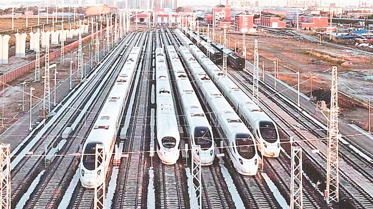 佳木斯高鐵站一列列高鐵動車整裝待發(fā)。