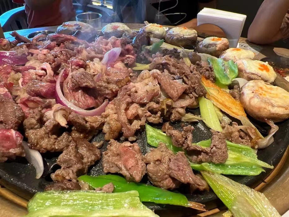 新生代烤肉店代表“撒撒米烤肉”內(nèi),早已客滿,排位等座的一撥接一撥。傳統(tǒng)拌肉、大片肉是當(dāng)?shù)厝诵念^好。隨著烤盤溫度升高,滋滋作響中,紋路清晰的肉肉慢慢由紅變褐,油脂流出,香氣四溢!一口下去,小朋友開心地跺腳直“哼哼”。