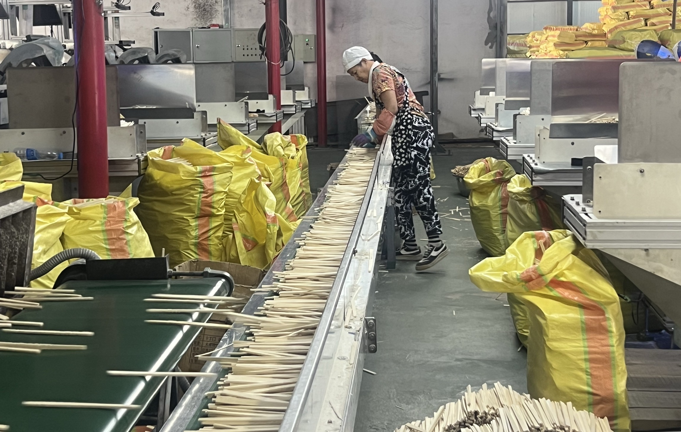 位于三村村的同江市鑫祥木業(yè)加工廠內(nèi),工人們?cè)诟髯缘膷徫簧厦β抵?,加工的牙簽、衛(wèi)生筷子等產(chǎn)品順著傳輸帶運(yùn)送到打包車間,打包后裝車運(yùn)往指定地點(diǎn),這些產(chǎn)品銷往日本、韓國(guó)等國(guó)家。