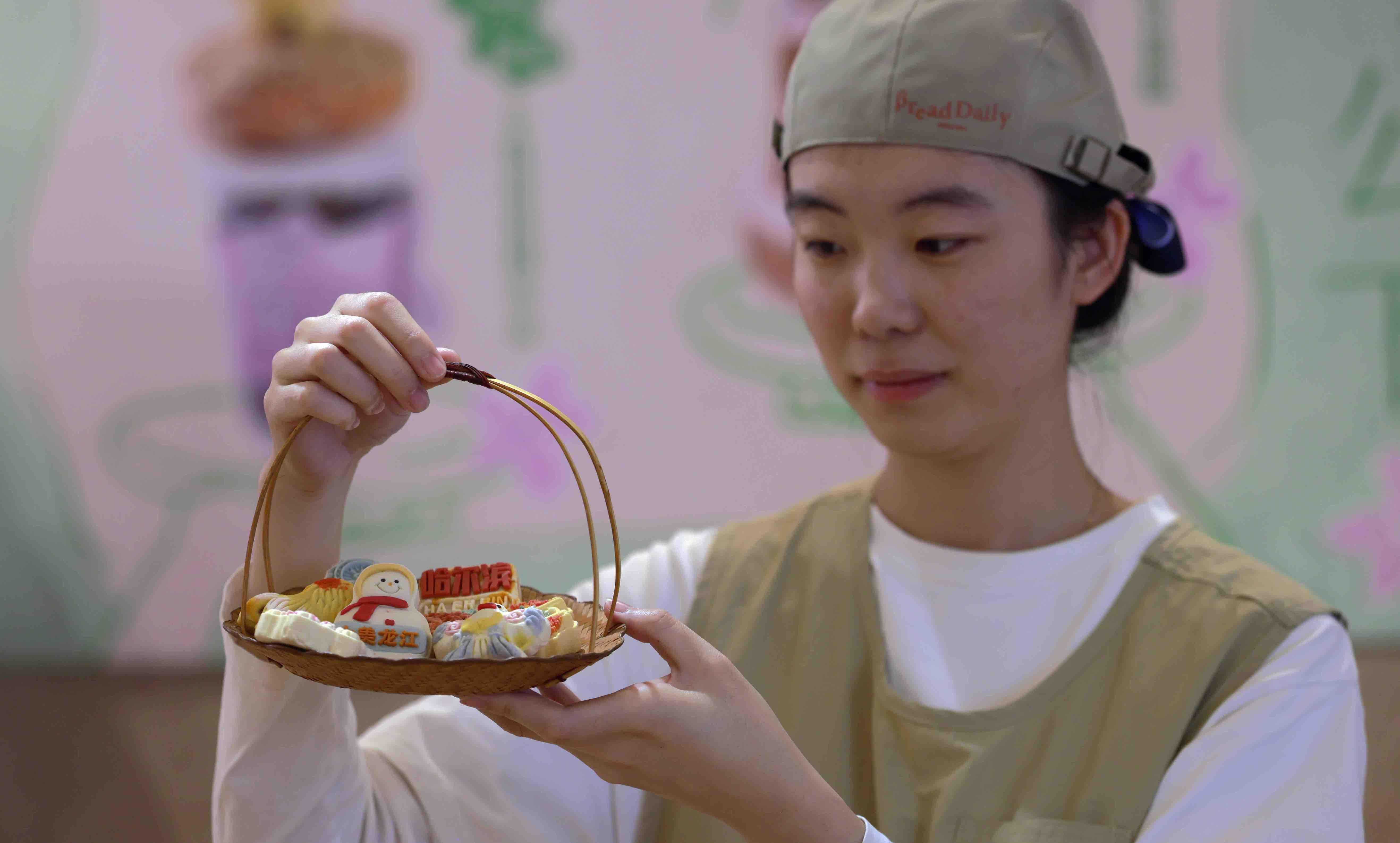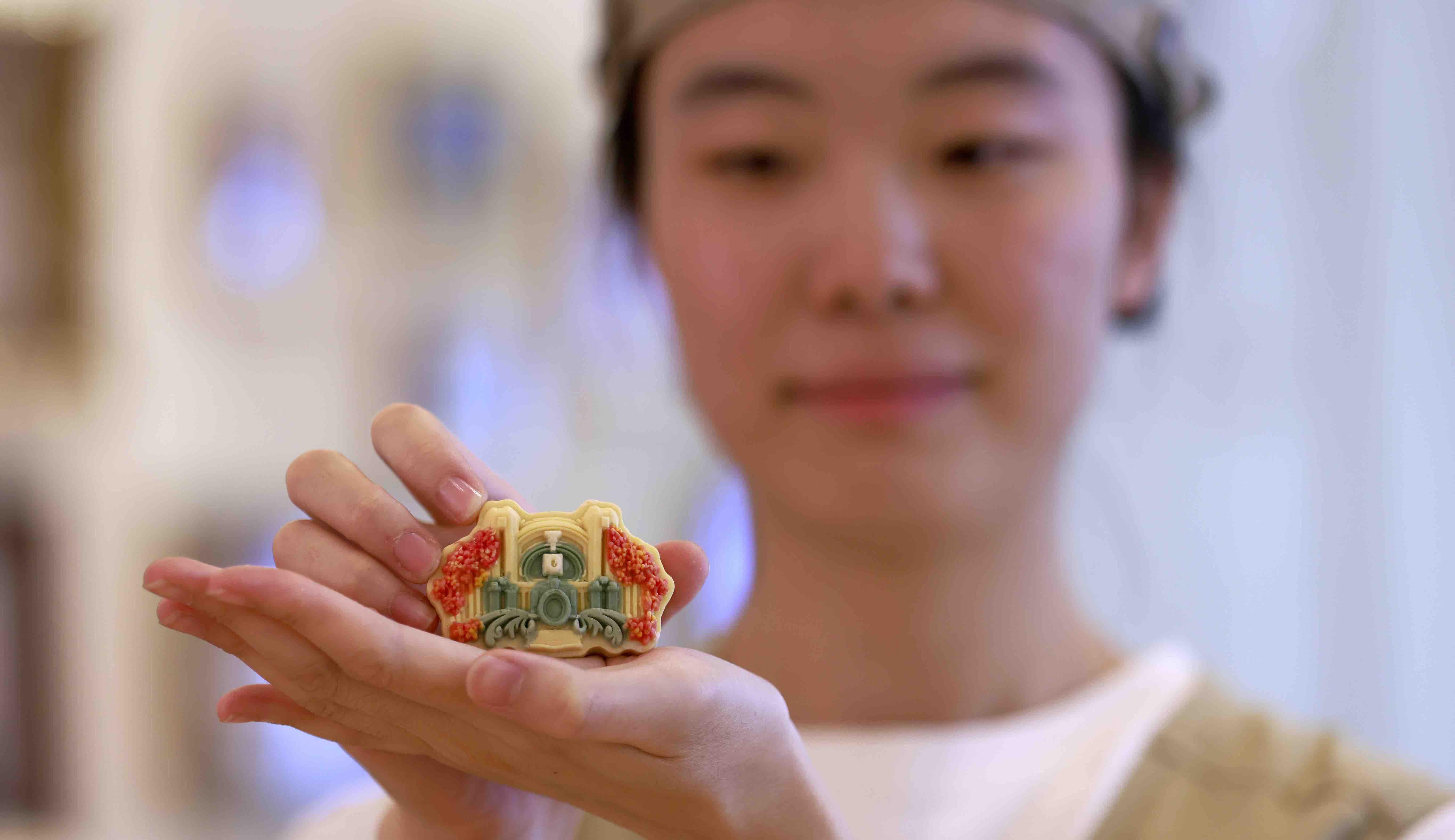 中秋節(jié)臨近,哈爾濱市的一家蛋糕店,推出多款融合了冰城地標(biāo)建筑的文創(chuàng)月餅。該套月餅共有八枚,由哈爾濱站、大雪人、雪花摩天輪以及雪花、風(fēng)箏等造型組成,每一款月餅都做得細(xì)膩、逼真。添加了蓮蓉蛋黃、咸蛋黃肉松、粒粒紅棗、高果肉山楂、低甜蓮蓉、桑葚黃精等餡料,口味豐富。